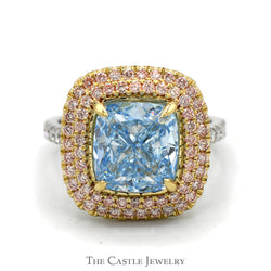 5ct Fancy Vivid Blue Cushion Cut Lab Grown Diamond Ring with Double Pink Diamond Halo in 14k White & Yellow Gold