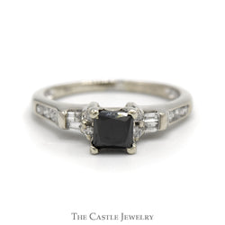 Princess Cut Black Diamond Engagement Ring with Round & Baguette Diamond Accents in 14k White Gold