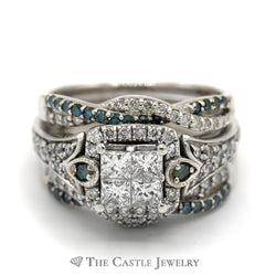 1.5cttw Princess Cut Invisible Set Diamond Cluster Soldered Bridal Set with Blue and White Diamond Accents in 14k White Gold
