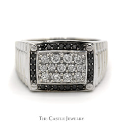 1cttw Diamond Cluster Ring with Black Diamond Bezel and Ridged Sides in 10k White Gold