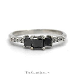 Princess Cut Black Diamond Three Stone Engagement Ring with White Diamond Accents in 10k White Gold