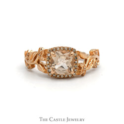 Cushion Cut Morganite Ring with Diamond Halo, Leaf & Flower Designed Sides in 14k Rose Gold