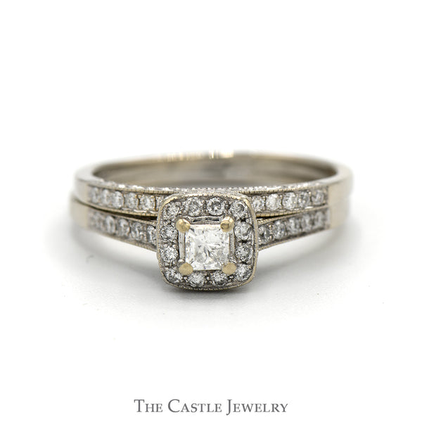 Princess Cut Diamond Bridal Set with Diamond Halo, Accented Sides and Matching Band in 14k White Gold