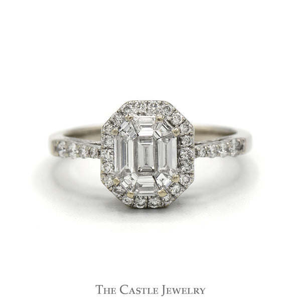1cttw Baguette Diamond Cluster Engagement Ring with Diamond Halo & Accented Sides in 14k White Gold