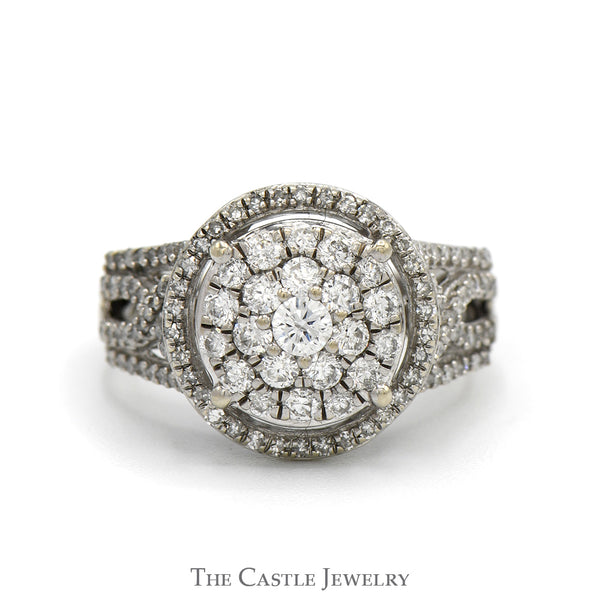 3/4cttw Round Diamond Cluster Engagement Ring with Diamond Halo and Diamond Accented Open Sides in 14k White Gold