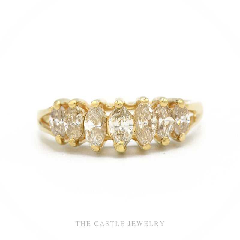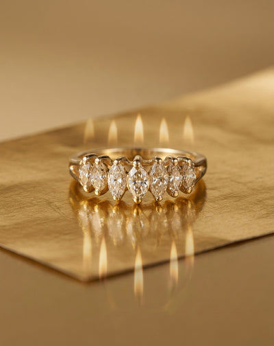 Seven marquise diamonds east-west-set in a continuous row across the top of a 14k yellow gold band. The seven-stone layout runs longer across the finger than a traditional five-stone — the whole top of the hand reads as one long ribbon of fire, with each marquise throwing the sharp, pointed kind of flash that only this cut produces. Flat-set shoulder to shoulder so the stones sit close to the skin and nothing catches. The warm yellow gold picks up the warm undertones in the diamonds; the full row carries across nearly the whole finger. A classic anniversary silhouette at nearly-one-carat weight.