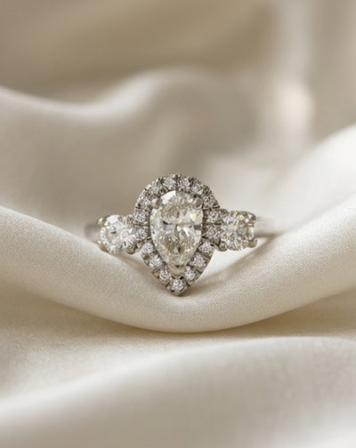 Pre-owned and professionally reconditioned. Pear-halo engagement rings at this stone density typically run well above $5,000 at mainstream retail — priced here at wholesale and ready to wear.