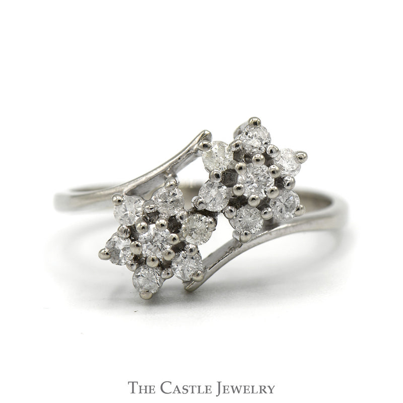 Embrace timeless beauty with this 1/2cttw Double Flower Diamond Cluster Ring, exquisitely crafted in 14k white gold. Featuring two delicate flower clusters, each adorned with sparkling diamonds, this ring captures the essence of elegance and grace. The bypass design gracefully intertwines the two clusters, allowing the diamonds to catch and reflect light from every angle. The sleek white gold setting enhances the brilliance of the diamonds, adding a touch of contemporary sophistication. Perfect for celebrating special occasions or adding a touch of luxury to your everyday wear, this ring is a stunning symbol of refined charm and style.
