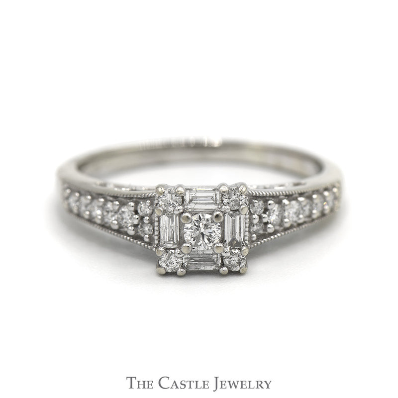 1/2cttw Square Shaped Baguette & Round Diamond Cluster Engagement Ring with Accents in 14k White Gold