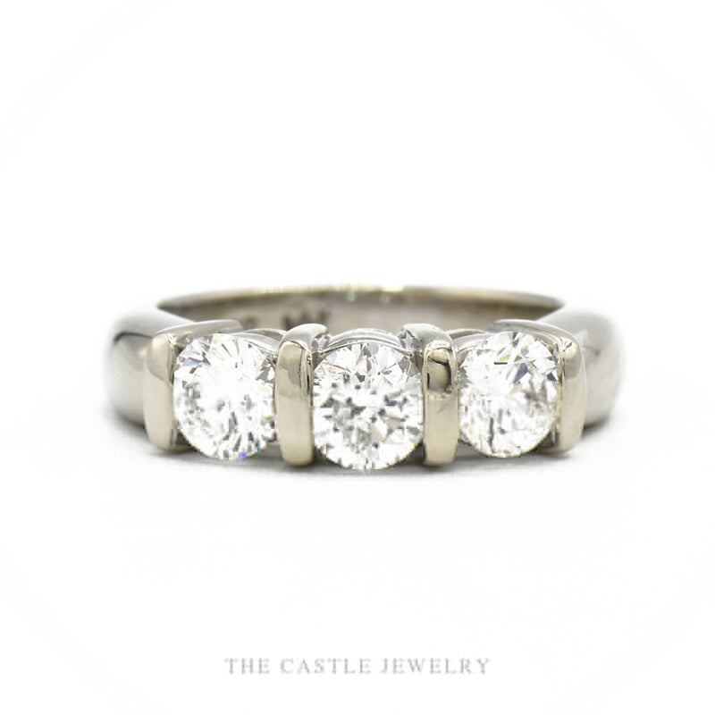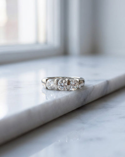 Three round brilliant diamonds held in bar-set tension mounts across a wide 14k white gold band. Each stone sits exposed on both sides, letting light pass through and around the diamonds rather than cupping them under a traditional prong — the stones look like they're levitating in the metal. The architecture is distinctly modern: nothing between the eye and the diamonds, every facet open to light. On the hand the piece reads architectural and deliberate, 5.6g of solid white gold with the three stones carrying the full past-present-future tradition in a thoroughly contemporary silhouette.