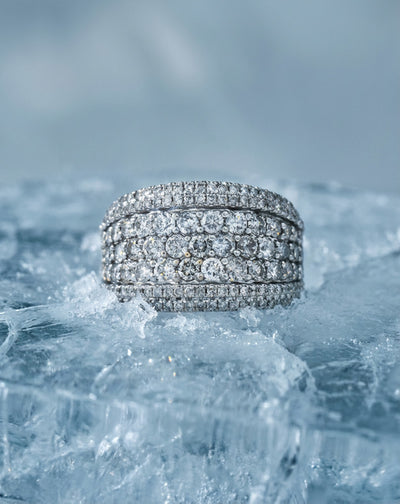 A wide 10k white gold band carrying three rows of pavé-set round brilliant diamonds — narrower pavé lines on the outer edges flanking a larger-stone center row that runs the full length of the band. The tiered construction builds depth across the face, so the whole top reads as one continuous sheet of ice rather than three separate rows. From across a room the effect is a solid white ribbon on the hand; up close, the center row pops slightly higher and catches more light than the edges. Substantial but wearable — wide enough to be the statement, balanced enough to wear all day.