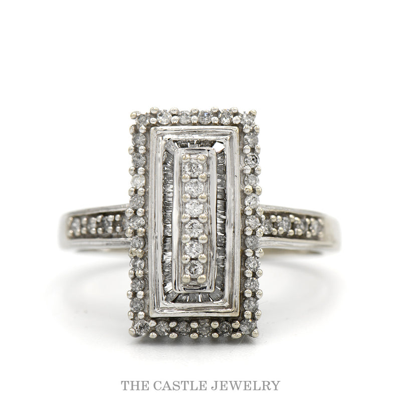 Command attention with this dazzling 10K White Gold 0.50ct Round and Baguette Diamond Rectangle Halo Ring—a design that blends modern radiance with timeless glamour. Crafted in lustrous white gold, its striking rectangular cluster features a captivating mix of round and baguette diamonds, each expertly arranged to create maximum brilliance and depth. The polished sides add a sleek finish, giving the ring a balanced elegance that transitions effortlessly from day to night.
