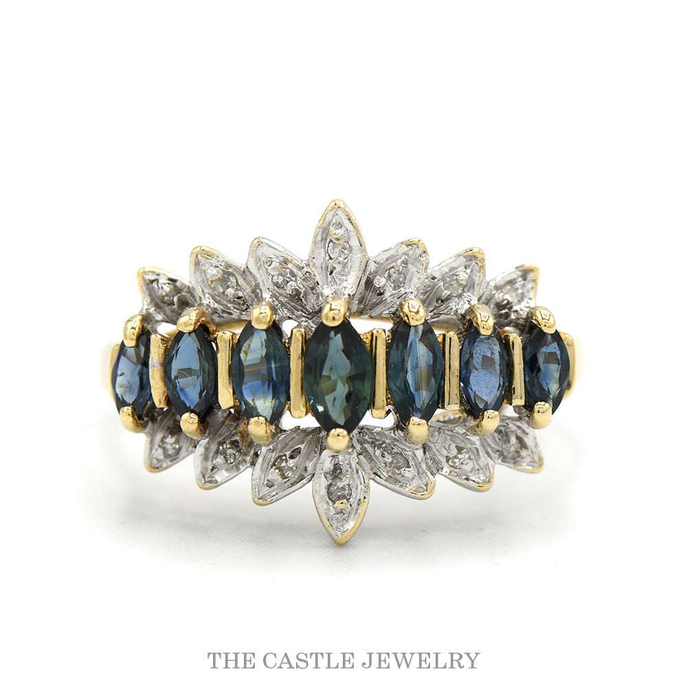 Radiate timeless elegance with this 14K Yellow Gold Marquise Sapphire and Diamond Accent Ring, a dazzling fusion of rich blue and brilliant gold. Seven striking marquise-cut sapphires create a captivating centerpiece, flanked by sparkling round diamonds that glint like starlight against the warm glow of 14K yellow gold. The layered, petal-like design adds an exquisite vintage allure, making this ring a true heirloom piece that stands out from every angle.