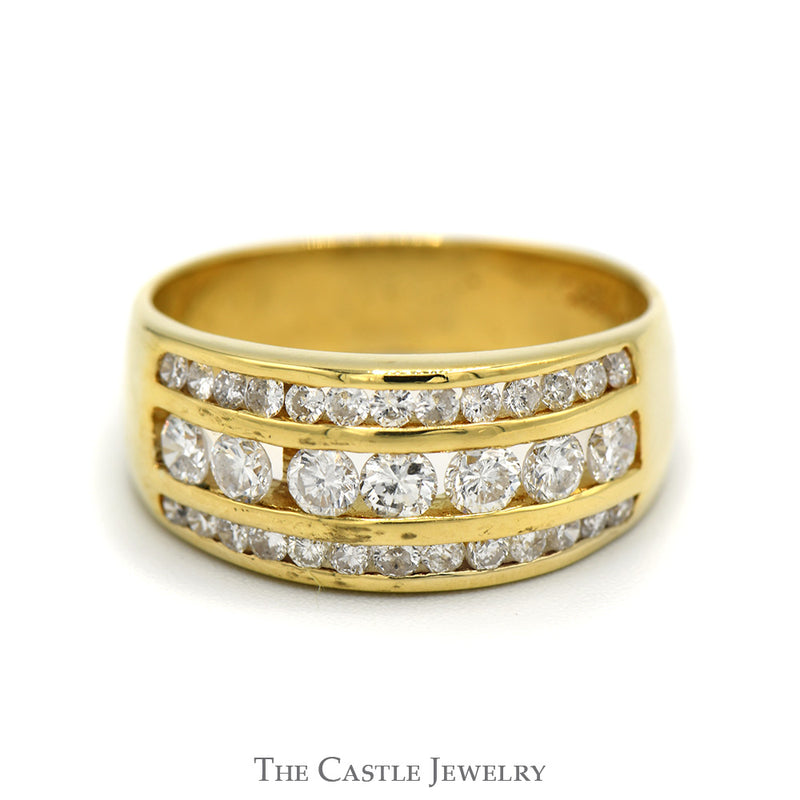 The 18k yellow gold band gleams with an ethereal radiance, while the diamond-studded rows sparkle and shine like the stars above. Each diamond has been carefully selected and meticulously placed in a channel setting to ensure maximum brilliance and fire. Whether worn as a wedding band or simply as a statement piece, this exquisite ring is sure to turn heads and capture hearts. Experience the unparalleled beauty and luxury of this breathtaking piece and elevate your jewelry collection to new heights!