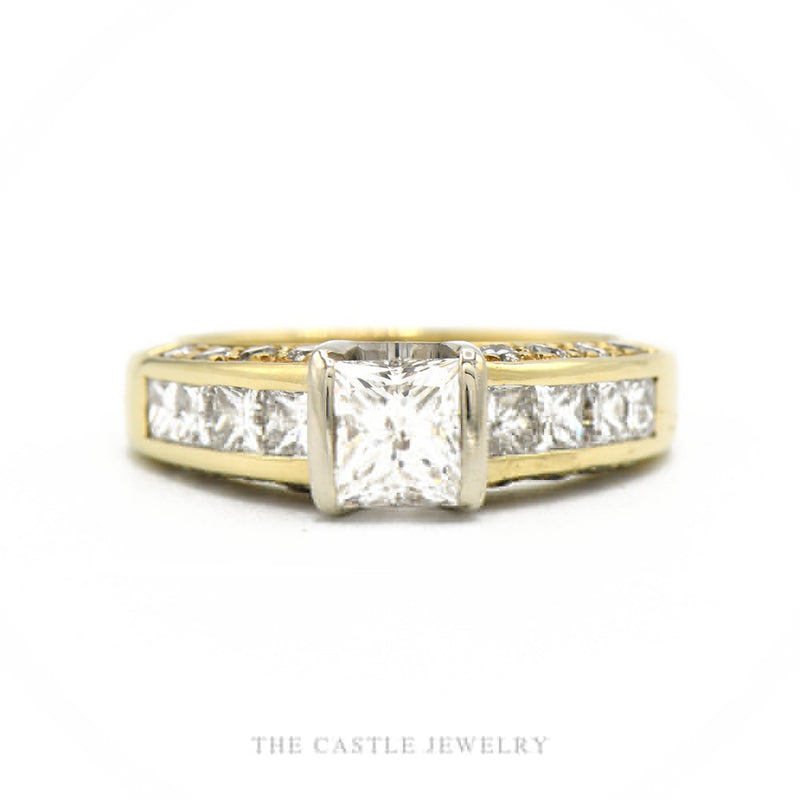A princess-cut diamond center rises off a 14k yellow gold shank in a bright white-gold head, flanked by a double channel of princess-cut diamonds running flush down each shoulder. The two-tone construction works hard — white gold surrounds the center stone to keep its light cool and clean, while the rich yellow body carries the full line of side stones with visible warmth between each princess. Two full carats of diamond across the face means the ring reads big from any angle; the crisp geometry of the princess cuts keeps it architectural rather than heavy. Statement-sized and engineered for the everyday.