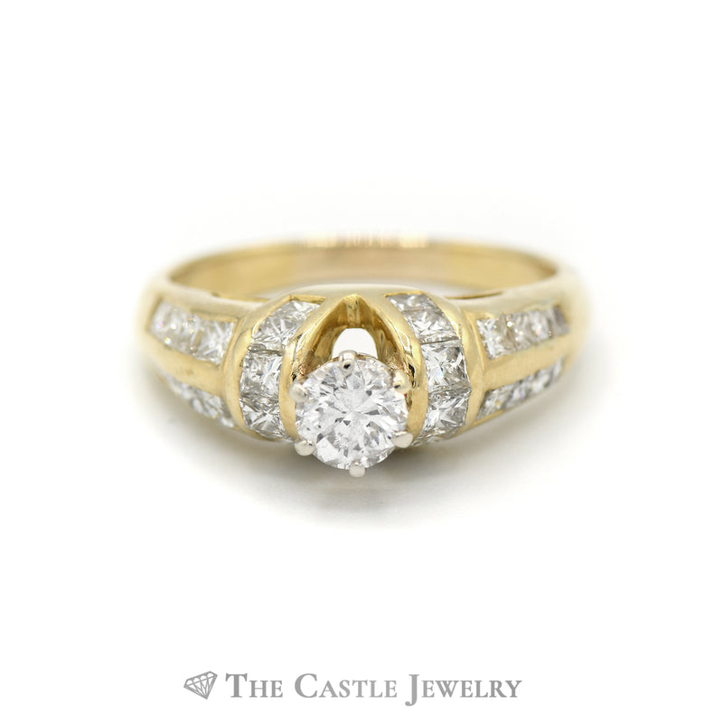 2CTTW Round Diamond Solitaire with Princess Cut Accents Bridal Ring in 14KT Yellow Gold