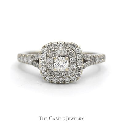 Celebrate your love with this breathtaking 3/4cttw diamond engagement ring, featuring a stunning double halo that beautifully enhances the center diamond. Crafted in luxurious 14k white gold, the ring showcases sparkling diamonds along the accented split shank sides, creating a captivating and opulent frame for your love story. This ring embodies romance and elegance, making it the perfect symbol of commitment for that special moment. Whether she prefers a classic or contemporary style, this timeless treasure is designed to dazzle for generations. Say "yes" to forever—make this exquisite ring yours today!