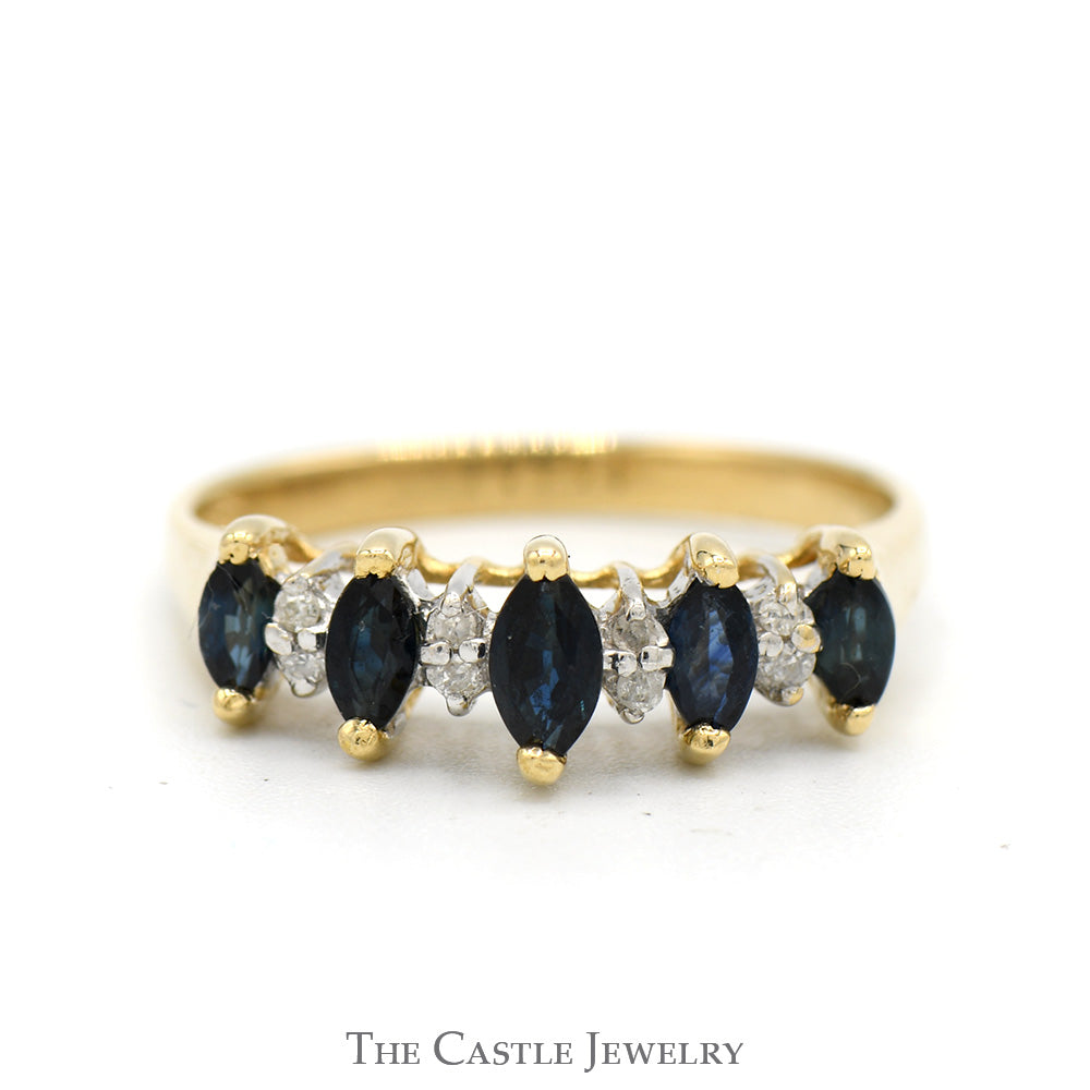 Indulge in timeless elegance with our stunning band ring featuring five exquisitely cut marquise sapphires, beautifully complemented by shimmering diamond accents. Crafted from luxurious 14k yellow gold, this piece radiates warmth and sophistication, making it perfect for any occasion—from engagements to anniversaries or simply to elevate your everyday style. The marquise shape enhances the sapphires' allure, creating an enchanting contrast with the glittering diamonds. Whether you wear it alone or stack it with your favorite rings, this ring is sure to captivate hearts and become a cherished addition to your jewelry collection. Don't miss the chance to own this piece of art!