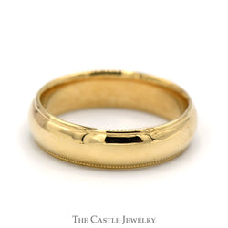 Embrace the essence of true love with this stunning 6mm Wedding Band, skillfully crafted in radiant 14k yellow gold. Featuring a sleek polished finish, its modern appearance is beautifully complemented by intricate milgrain edges that evoke a timeless elegance. This exquisite ring symbolizes your unbreakable bond, making it the perfect choice for a wedding or commitment ceremony. Designed for comfort, it seamlessly fits into your everyday wear while serving as a constant reminder of your cherished moments together. Celebrate your journey with this elegant wedding band—an essential piece that encapsulates your love story in every gleam. Choose this classic design and let your love shine through!