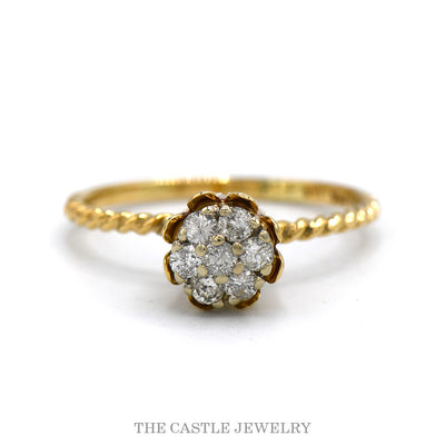 Embrace timeless elegance with our stunning 7 Round Diamond Flower Cluster Ring, beautifully crafted in 14k yellow gold. This exquisite piece showcases a breathtaking cluster of seven brilliant diamonds arranged in a floral design, creating a radiant centerpiece that symbolizes love and beauty. The ring's unique twisted design on the sides adds a touch of modern flair, enhancing its appeal and making it a perfect statement piece for any occasion. Whether it’s an engagement, anniversary, or a gift for someone special, this diamond ring is a celebration of enduring elegance and a cherished addition to any jewelry collection. Shine bright with this floral masterpiece!