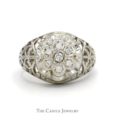 Step into elegance with this exquisite 7 Round Diamond Kentucky Cluster Ring, beautifully crafted in 14k white gold. The stunning cluster of seven round diamonds creates a captivating centerpiece, radiating brilliance and charm. Enhance your style with the intricately designed open filigree sides, which lend a vintage-inspired touch, showcasing meticulous craftsmanship. Perfect for engagements or as a statement piece, this ring embodies sophistication and romance. Whether treating yourself or surprising a loved one, this extraordinary piece is sure to become a cherished heirloom. Don't miss out—make this enchanting ring yours today!