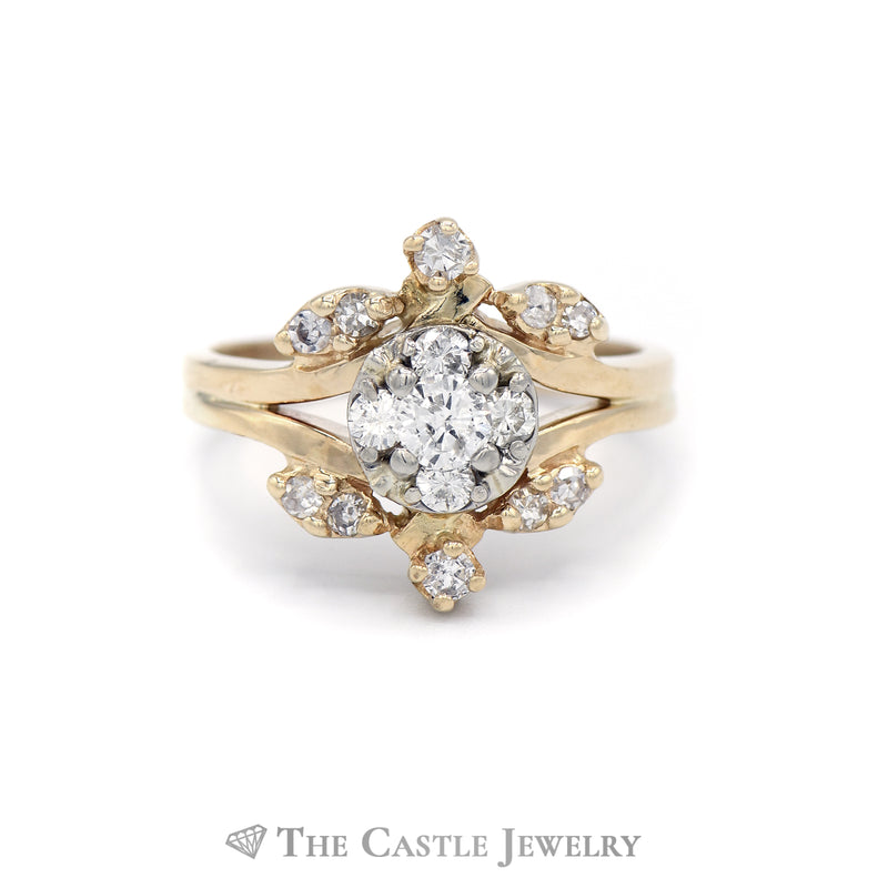 This stunning ring features a round five diamond center with diamond accents above and below in a "V" shape and has been perfectly crafted in 14kt yellow gold.