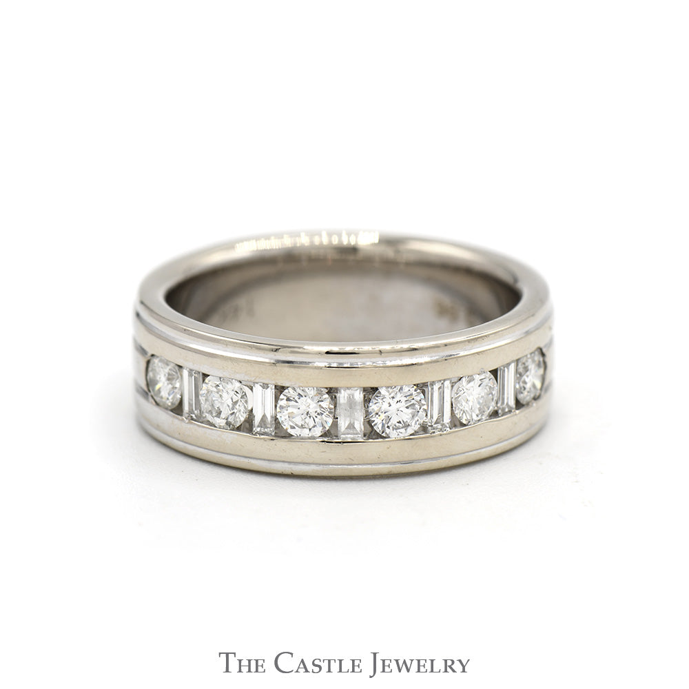 Say "I do" with sophistication and style in our Alternating Round & Baguette Cut Diamond Men's Wedding Band, crafted in high-quality 14k white gold. This striking ring features a harmonious blend of round and baguette cut diamonds, skillfully arranged to create a captivating pattern that exudes elegance and modernity. The white gold setting enhances the diamonds' brilliance, ensuring that every detail shines on your special day. Designed for the modern man, this wedding band represents commitment and timeless love, making it the perfect symbol of your union. Celebrate your journey together with this stunning piece that beautifully complements your unique style.