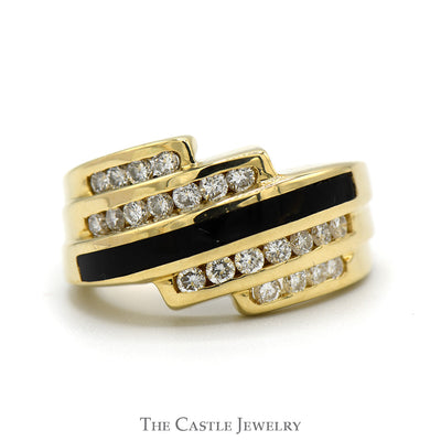 Discover a fusion of striking contrast and elegance with this Black Onyx Inlay and Channel Set Diamond Bypass Ring. Crafted in radiant 14k yellow gold, this exquisite ring features a sleek black onyx inlay, offering a dramatic backdrop for the brilliance of the channel-set diamonds. The bypass design adds a modern and dynamic twist, allowing the gemstones to take center stage. Perfect for those who appreciate bold and sophisticated style, this ring effortlessly transitions from day to night, making every occasion special. Enhance your jewelry collection with this captivating and unique masterpiece.
