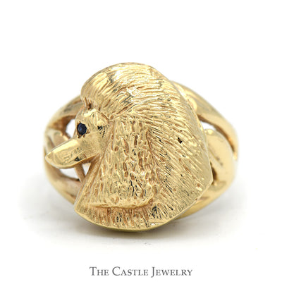 Showcase your love for pets with our Detailed Poodle Head Ring, beautifully crafted in 10k yellow gold. This whimsical piece features an intricately designed poodle head, capturing the elegant contours and unique charm of this beloved breed. The vibrant sapphire eyes add a dazzling touch, enhancing the ring's character and brilliance. Perfect for dog lovers or anyone who appreciates unique jewelry, this ring effortlessly combines artistry with a playful spirit. Whether gifting it to a fellow dog lover or treating yourself, this delightful ring is sure to spark joy and admiration. Wear it proudly and let your style shine with personality!