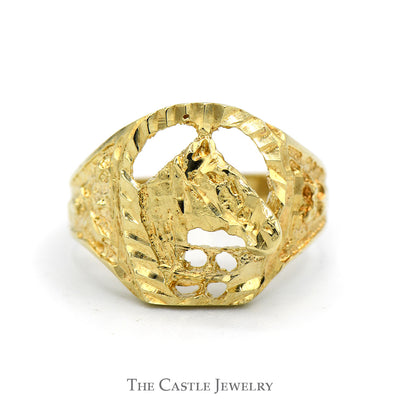 Step into a world of elegance and charm with our Horseshoe Ring, crafted in 14k yellow gold. This distinctive piece features a beautifully detailed horse head nestled within a classic horseshoe design, symbolizing good luck and hope. The eye-catching diamond cut pattern adds texture and brilliance, enhancing the ring’s overall radiance. Perfect for equestrian enthusiasts or anyone who appreciates unique jewelry, this ring makes a meaningful gift or a remarkable addition to your collection. Wear it as a charming statement piece or as a daily reminder of your passions. Embrace fortune and style—make this captivating ring yours today!