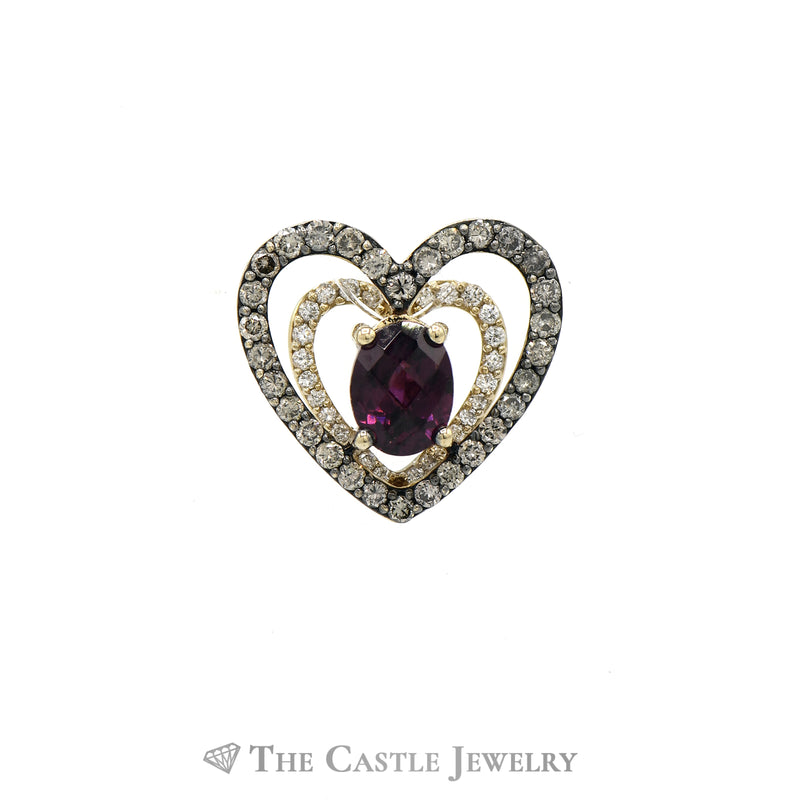 This stunning heart pendant features a 1ct raspberry garnet, .60cttw white and chocolate diamonds and has been perfectly crafted in 14kt rose gold.