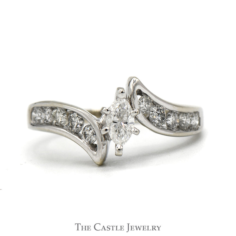 Declare your love with the stunning Marquise Cut Diamond Engagement Ring. Featuring a .25 carat marquise cut diamond at its center, this ring glistens with an air of refined elegance. The band is beautifully adorned with channel-set round brilliant cut diamonds totaling .40 carats with total diamond weight of .65 carats, enhancing the ring's brilliance and allure. Crafted in luminous 14KT white gold, this piece elegantly blends classic sophistication with modern style. Perfect for symbolizing your enduring commitment, this ring is designed to be cherished for a lifetime, reflecting the beauty of your unique love story.