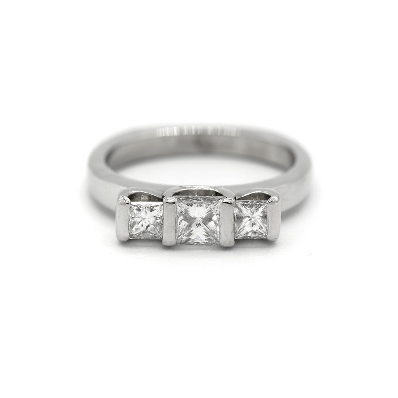 A modern twist on a past, present, future ring in platinum featuring three tension set princess cut diamonds with total weight of 1.00 carats.