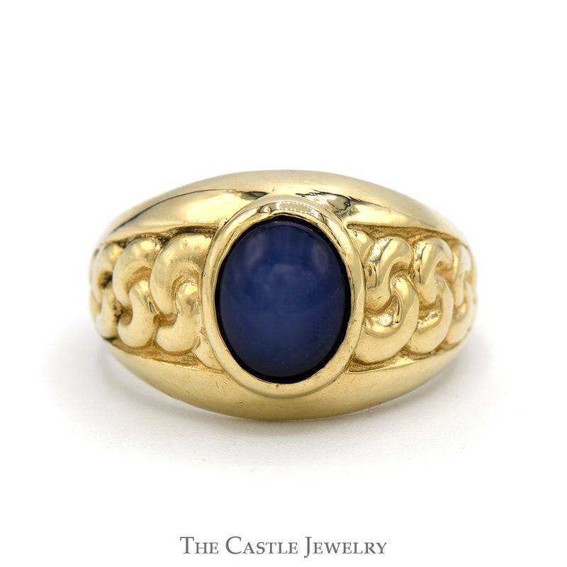 Illuminate your elegance with this stunning Oval Cabochon Blue Lindy Star Ring, beautifully crafted in 10k yellow gold. The mesmerizing blue cabochon takes center stage, featuring the captivating star effect that dances in the light, reminiscent of a tranquil evening sky. Adorned with intricately braided sides, this ring combines contemporary design with classic craftsmanship, making it a perfect accessory for any occasion. Whether you're dressing up for a night out or adding flair to your everyday look, this ring is a striking embodiment of style and grace. Elevate your collection with this exquisite piece today!