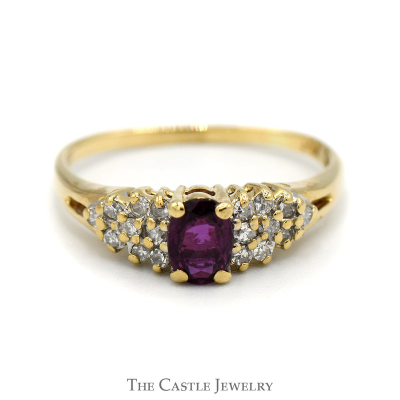 Indulge in the captivating allure of our Oval Ruby Ring, artfully crafted with Diamond Cluster Accents in 14k Yellow Gold. This breathtaking piece of jewelry is a testament to timeless elegance and refined grace, showcasing a magnificent oval ruby that dances with a fiery, passionate red hue. The ruby is surrounded by an exquisite cluster of sparkling diamonds, each carefully selected for their brilliance and set in an intricate pattern, accentuating the intense beauty of the central gemstone. The glittering ensemble is delicately mounted on a band of polished 14k yellow gold, offering a stunning contrast that heightens the allure of the piece. This ring is not just a piece of jewelry, but a tangible expression of opulence and sophistication, poised to add a touch of luxury to any ensemble. Perfect for those special occasions, or simply to celebrate the everyday, this Oval Ruby Ring with Diamond Cluster Accents in 14k Yellow Gold is a radiant testament to exquisite craftsmanship and timeless design.