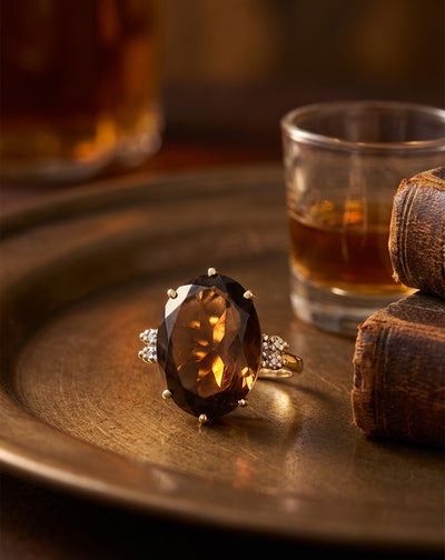 A faceted oval smoky quartz set as the center stone in a 10k yellow gold prong mount, with a scatter of small illusion-set diamonds worked across both shoulders. The warm brown of the quartz reads like bourbon against the yellow gold — a color pairing that feels distinctly earthy and grown-up, not trying to look like anything it isn't. The illusion-set mounts magnify each little shoulder diamond with mirror-finished gold, so the accents read far bigger than their actual weight. A gemstone ring with real presence at a daily-wear price point.