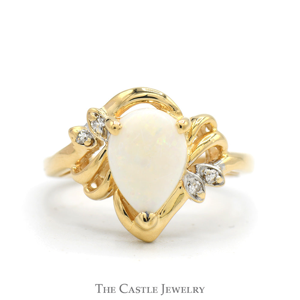 Illuminate your style with our exquisite Pear Cut Opal Ring, elegantly crafted in 14k yellow gold. This captivating ring features a mesmerizing pear-shaped opal that displays a kaleidoscope of colors, shimmering with every movement. Flanking the opal are stunning diamond accents set in an illusion design, enhancing the ring's brilliance and creating a dazzling effect. The warm tones of the yellow gold beautifully complement the vibrant opal, making this piece a perfect statement for any occasion. Ideal for engagements, anniversaries, or simply as a standout addition to your jewelry collection, this enchanting opal ring is sure to be cherished for years to come. Embrace the magic of opals and let your elegance shine!