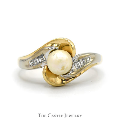 Embrace timeless elegance with this exquisite Pearl Ring, designed with dazzling baguette cut diamond accents in a stunning swirled bypass setting. The lustrous pearl, a symbol of purity and sophistication, takes center stage, elegantly embraced by the sparkling diamonds that add a luxurious touch. Crafted in 10k yellow gold, the unique swirled design creates an alluring and modern silhouette that beautifully highlights the beauty of the pearl and diamonds. This ring is perfect for special occasions, bridal celebrations, or as a delightful addition to your jewelry collection. Let this captivating pearl ring be a cherished piece, radiating grace and sophistication with every wear!