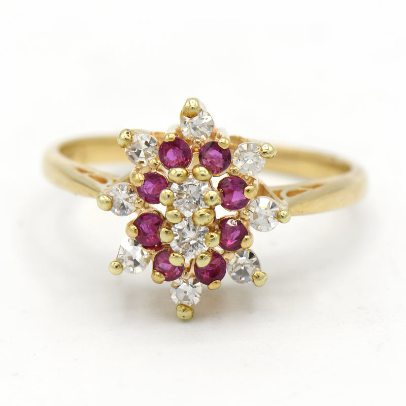 This breathtaking Ruby and Diamond Cluster Ring in 14k Yellow Gold Cathedral Mounting is a timeless piece of elegance. Crafted with 14k yellow gold, the cathedral mounting enhances the vibrant ruby and diamond cluster design, which is sure to draw admiring glances. The center diamonds are surrounded by a breathtaking halo of vibrant rubies that sparkle and shine, adding undeniable glamour and sophistication. This exquisite ring is sure to be the envy of all and will be the perfect addition to any fine jewelry collection