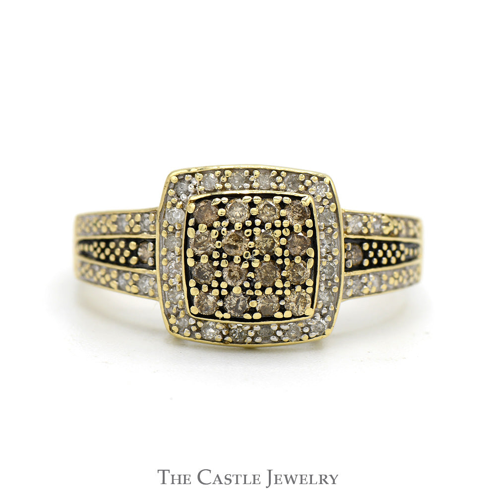 Elevate your style with this stunning square-shaped brown diamond cluster ring, beautifully embraced by a sparkling white diamond halo. Crafted in luxurious 10k yellow gold, this exquisite piece captures attention from every angle. The rich, warm tones of the brown diamonds contrast elegantly with the shimmering white diamonds, creating a harmonious balance that celebrates both sophistication and individuality. Accented sides add a touch of delicate detail, making this ring perfect for both special occasions and everyday elegance. Don’t just wear jewelry—make a statement. Treat yourself or a loved one to this charming ring today!