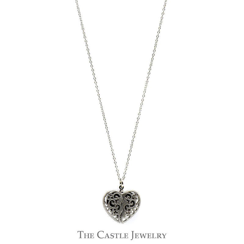Indulge in an exquisite expression of timeless elegance with our Sterling Silver "Inner Beauty" Heart Shaped Necklace. Featuring a unique split heart with open filigree detail that opens up to reveal a diamond accented heart inside. This exquisite piece of jewelry is a radiant symbol of love, designed with the utmost care and precision. The pendant, beautifully molded into a heart, represents the profound love and affection you hold. Its sterling silver composition ensures a lustrous shine that captures the light in the most enchanting way. The core of this heart-shaped necklace is adorned with a sparkling diamond accent, a precious gem synonymous with strength and everlasting love. This meticulously crafted diamond not only adds a touch of luxury but also brings an element of sophistication and class to the piece. The pairing of sterling silver and diamond in this necklace promises a high-end, chic look that can seamlessly transition from day to night. Wear this captivating "Inner Beauty" necklace to remind yourself of the love that resides within you or gift it to a special someone to capture a moment, a sentiment, a lifetime. With this necklace, inner beauty is not just felt, it is seen and admired.