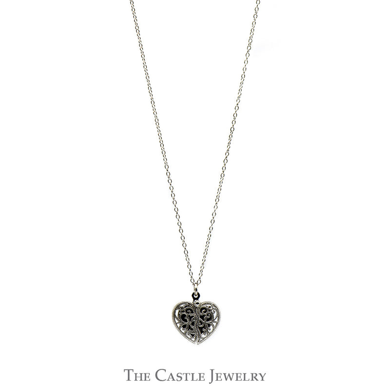 Indulge in an exquisite expression of timeless elegance with our Sterling Silver "Inner Beauty" Heart Shaped Necklace. Featuring a unique split heart with open filigree detail that opens up to reveal a diamond accented heart inside. This exquisite piece of jewelry is a radiant symbol of love, designed with the utmost care and precision. The pendant, beautifully molded into a heart, represents the profound love and affection you hold. Its sterling silver composition ensures a lustrous shine that captures the light in the most enchanting way. The core of this heart-shaped necklace is adorned with a sparkling diamond accent, a precious gem synonymous with strength and everlasting love. This meticulously crafted diamond not only adds a touch of luxury but also brings an element of sophistication and class to the piece. The pairing of sterling silver and diamond in this necklace promises a high-end, chic look that can seamlessly transition from day to night. Wear this captivating "Inner Beauty" necklace to remind yourself of the love that resides within you or gift it to a special someone to capture a moment, a sentiment, a lifetime. With this necklace, inner beauty is not just felt, it is seen and admired.