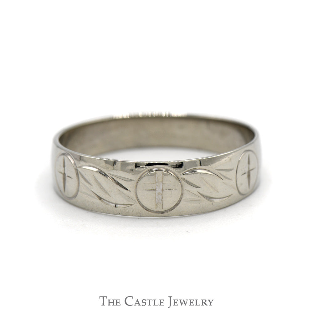 Embrace a timeless expression of faith and elegance with our Tapered Diamond Cut Etched Cross Band, beautifully crafted in 10k white gold. This exquisite ring features a distinctive cross design with a delicate etched pattern, symbolizing strength and devotion. The tapered silhouette adds a modern touch, enhancing comfort without compromising on style. Ideal for everyday wear or special occasions, this ring radiates a subtle luster, reflecting light with every movement. Perfect as a meaningful gift for yourself or a loved one, this stunning piece is not just jewelry—it's a cherished reminder of your beliefs and values. Celebrate your journey in elegance!