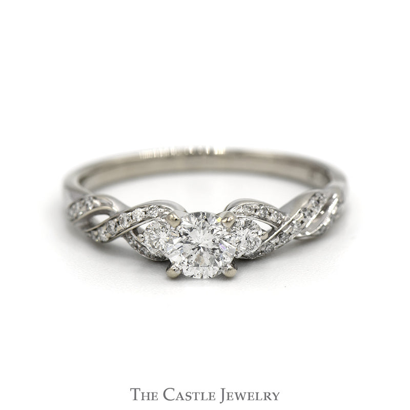 Three Stone Diamond Engagement Ring with Accented Twisted Sides in 14k White Gold