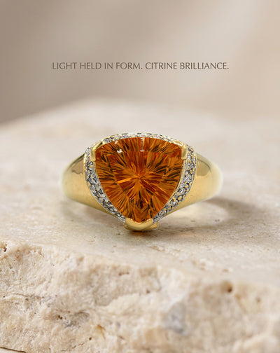 Radiate with golden brilliance and make every gesture unforgettable when you slip on this 14K Yellow Gold Trillion Cut Citrine Ring with Bezel Set Diamond Accents. The eye-catching trillion cut citrine bursts with fiery warmth, expertly framed by delicate rows of bezel-set round brilliant diamonds for a dazzling contrast that captures light from every angle.