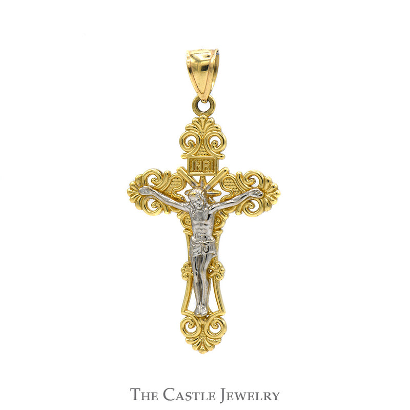 Experience the beauty of faith with this intricately designed Two-Tone Crucifix Pendant, masterfully crafted from 14k white and yellow gold. This striking piece features a beautifully detailed depiction of Christ on the cross, skillfully rendered in white gold, which accentuates his form with a radiant sheen. The backdrop of the crucifix is adorned with ornate yellow gold scrollwork that enhances the piece's depth and elegance, adding a touch of classical beauty. Gift it to someone special or add it to your own collection—this exquisite crucifix is a timeless piece that honors spirituality with artistry and grace.