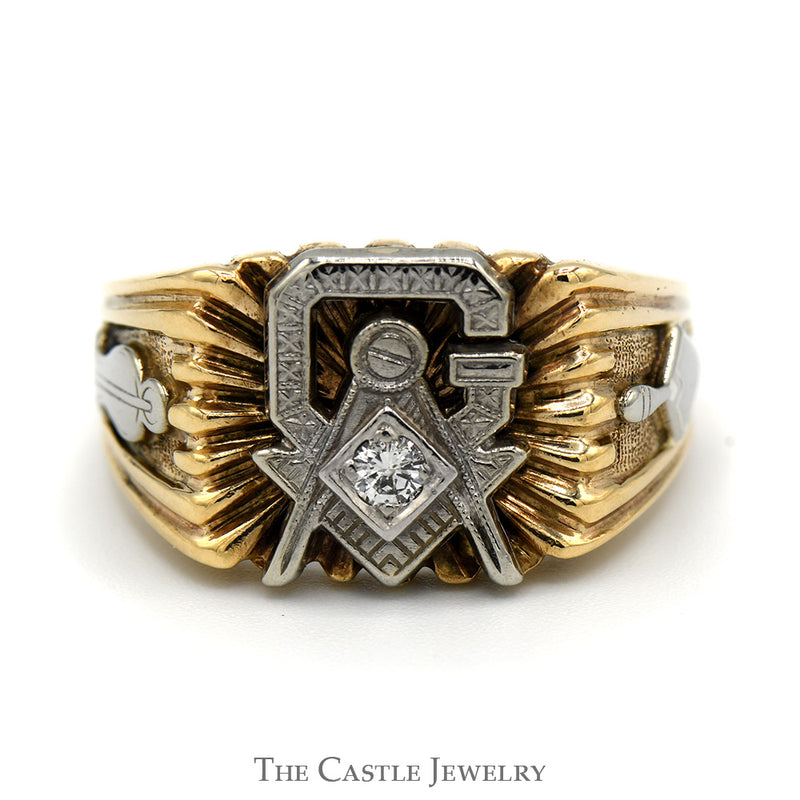 Introducing the epitome of timeless elegance and grandeur, our Men's Two Tone Diamond Masonic Ring. Intricately crafted from exquisite 10k White and Yellow Gold, this ring is more than just a piece of jewelry – it's a symbol of tradition, fraternity and honor. Its striking two-tone design elegantly balances the lustrous white gold with the warm, radiant yellow gold, creating a captivating harmony that is pleasing to the eye. At the heart of the ring lies a brilliantly cut diamond, twinkling with an unmatched radiance that is sure to catch the gaze of every onlooker. The Masonic symbol, etched meticulously on the surface, adds a touch of enigmatic allure and mystique, making it an ideal accessory for the modern man who appreciates the finer things in life. This ring is not just a piece of jewelry, it's a statement of sophistication and class. Slip this symbol of unyielding strength and enduring style onto your finger and let it speak volumes about your taste and character.