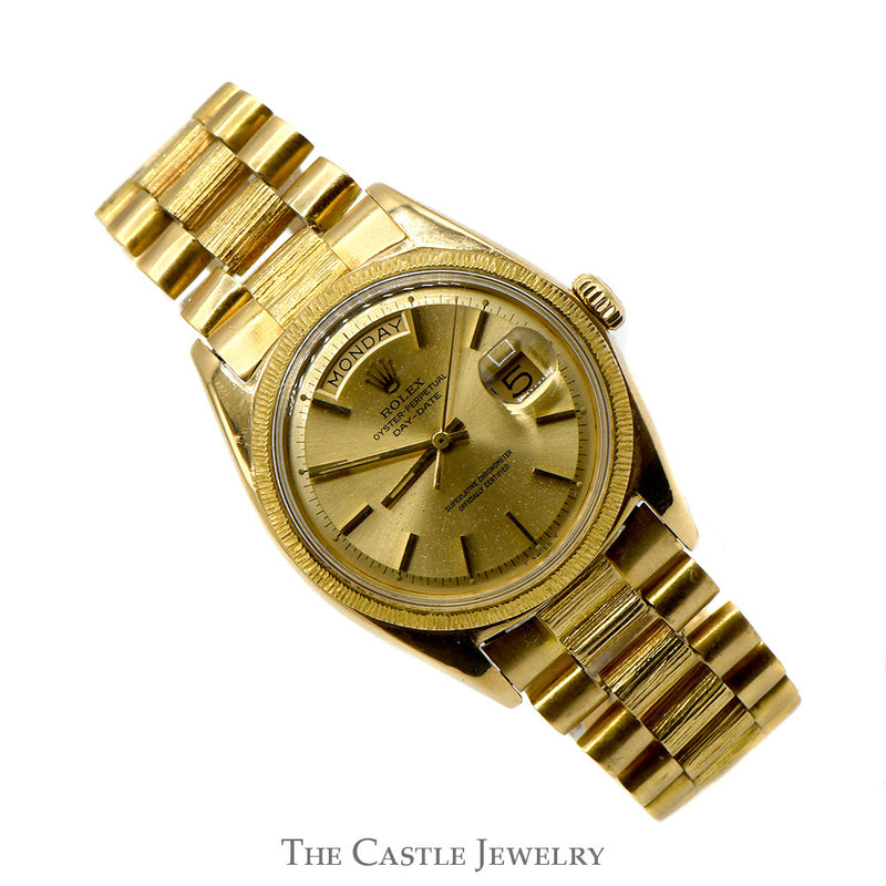 Indulge in a piece of history with our Vintage Rolex Presidential Day-Date 1807 in sophisticated 18k Yellow Gold Presidential Bracelet with Brushed textured links. This timepiece not only exudes class and elegance but also a fascinating backstory. The finely brushed bezel captures the eye while the 18k yellow gold bracelet promises a touch of sublime comfort around your wrist. Its remarkable design is expertly balanced with peerless functionality, carrying the prestigious Day-Date feature for your convenience. The ticking heart of this classic timepiece is certified by its original papers, affirming its authentic Rolex heritage. Elevate your watch collection with this timeless vintage Rolex, combining prestige, performance, and pure comfort to connect your style with the world's leading luxury watch brand.